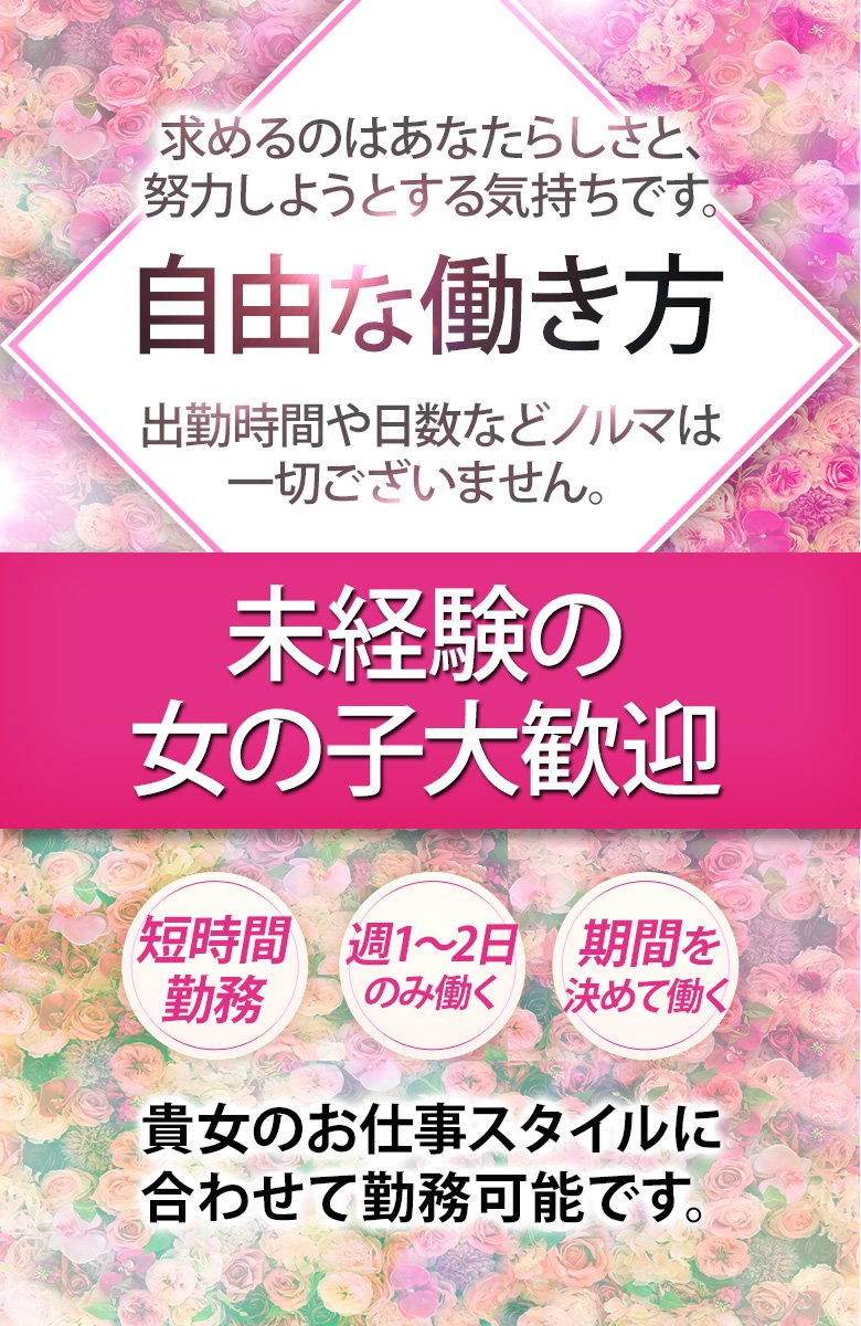 初めての事で不安もあれば緊張もすると思います 稼げます! ・未経験で何もわからないから上手く行くか不安 ・こんな私でも稼げるのかな? そんな不安もあると思いますが 「未経験」が武器になります! 実際に働いている女の子の多くは 未経験からスタートです。 当店だと【43%】が未経験スタートです 大手グループなので女の子を 稼がせるノウハウがあります 総勢約10名のスタッフが あなたの目標達成をサポートします |