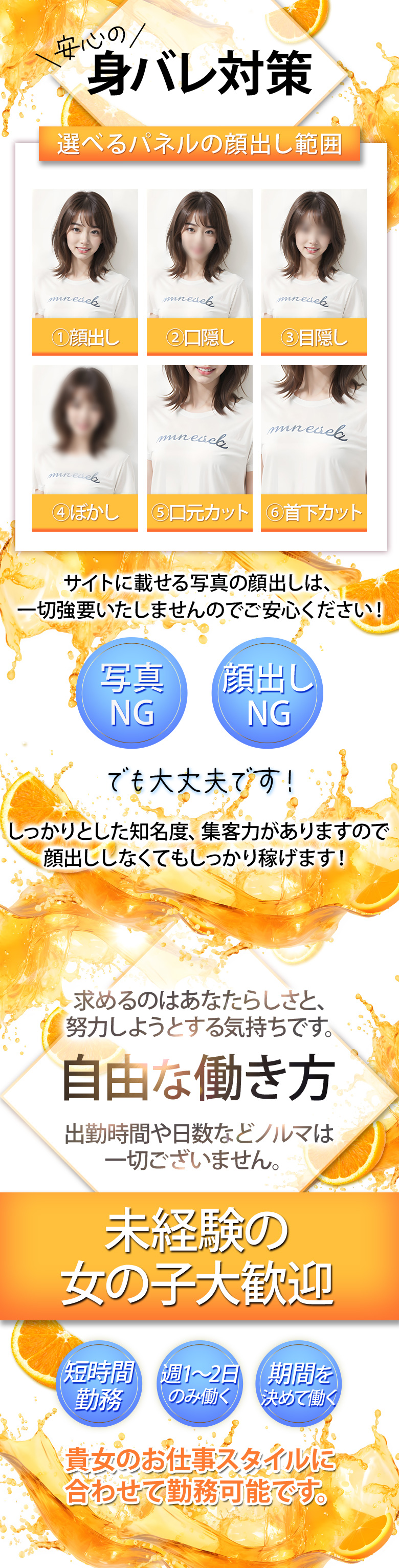 | A | 顔出しなしでも稼げるよう工夫しています。プロフィール写真や演出のサポートも万全です。 |